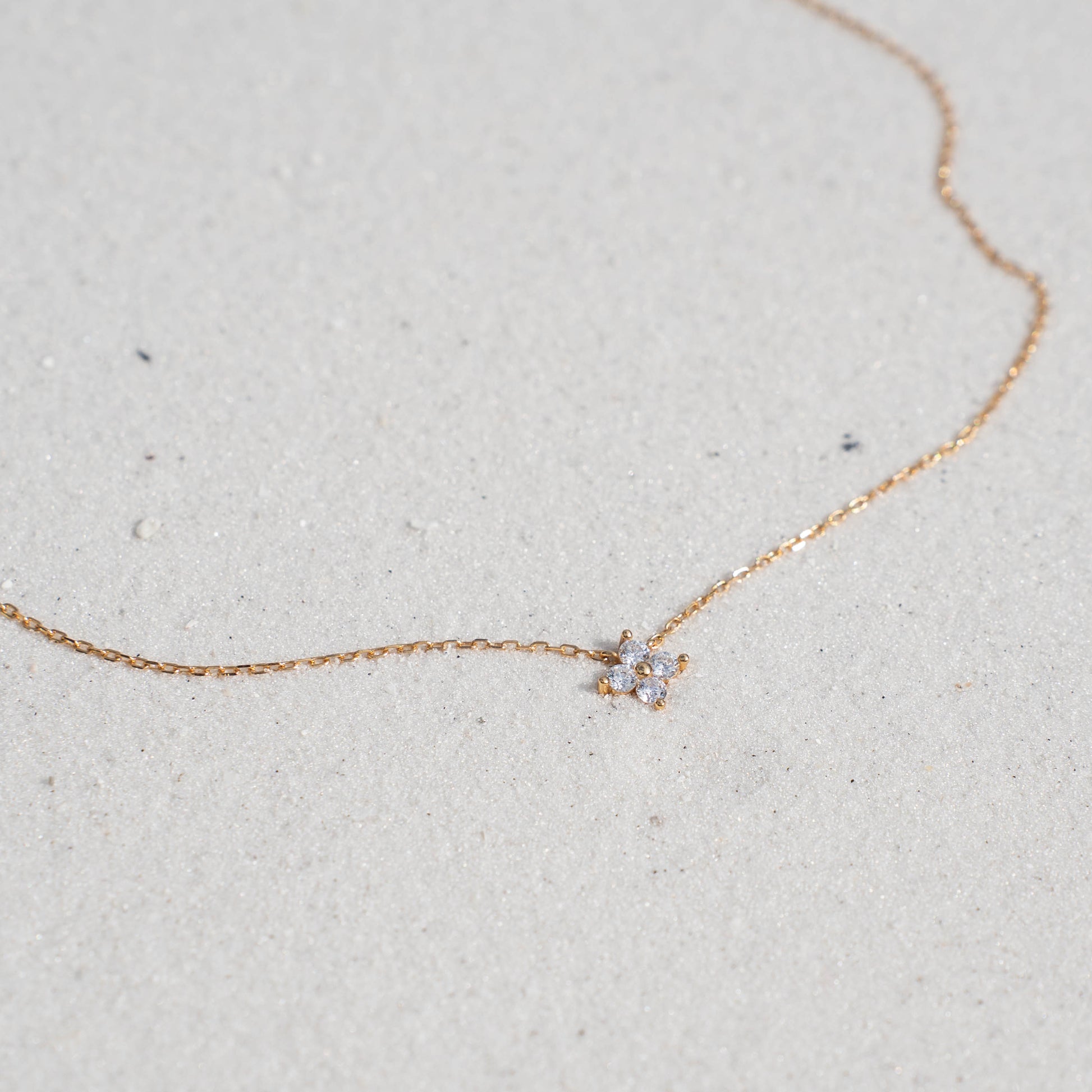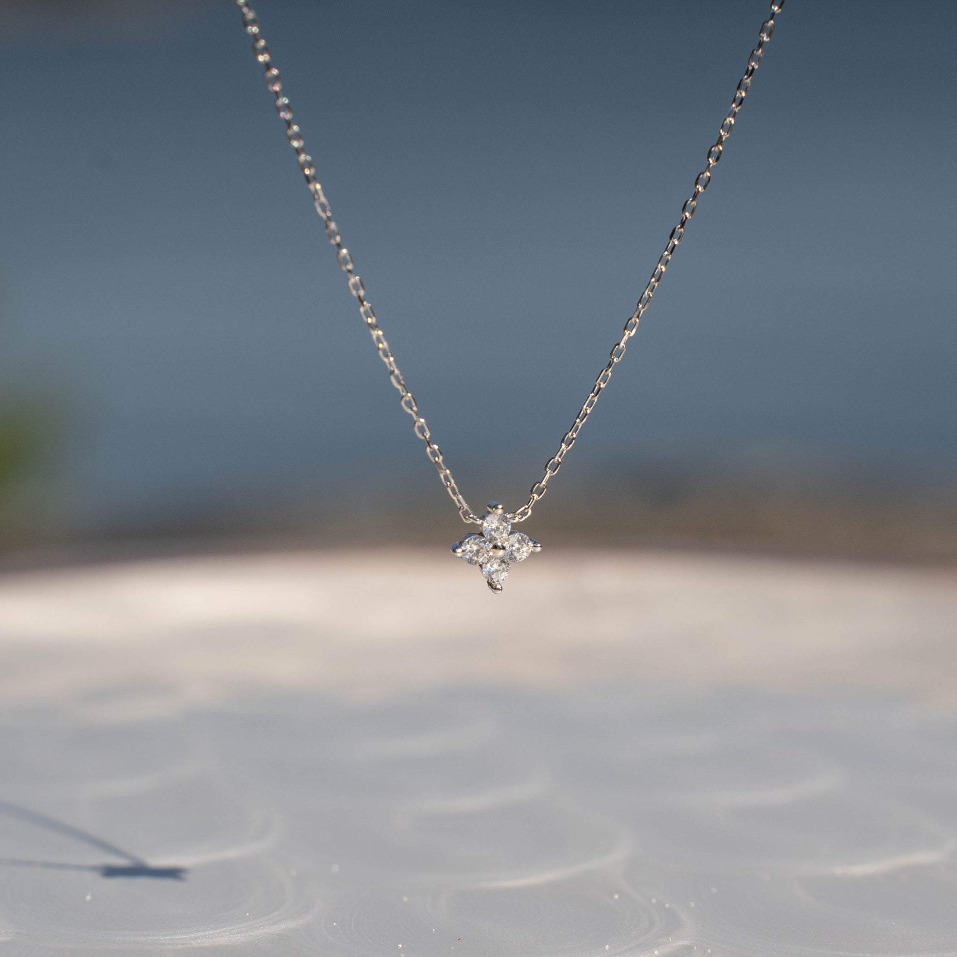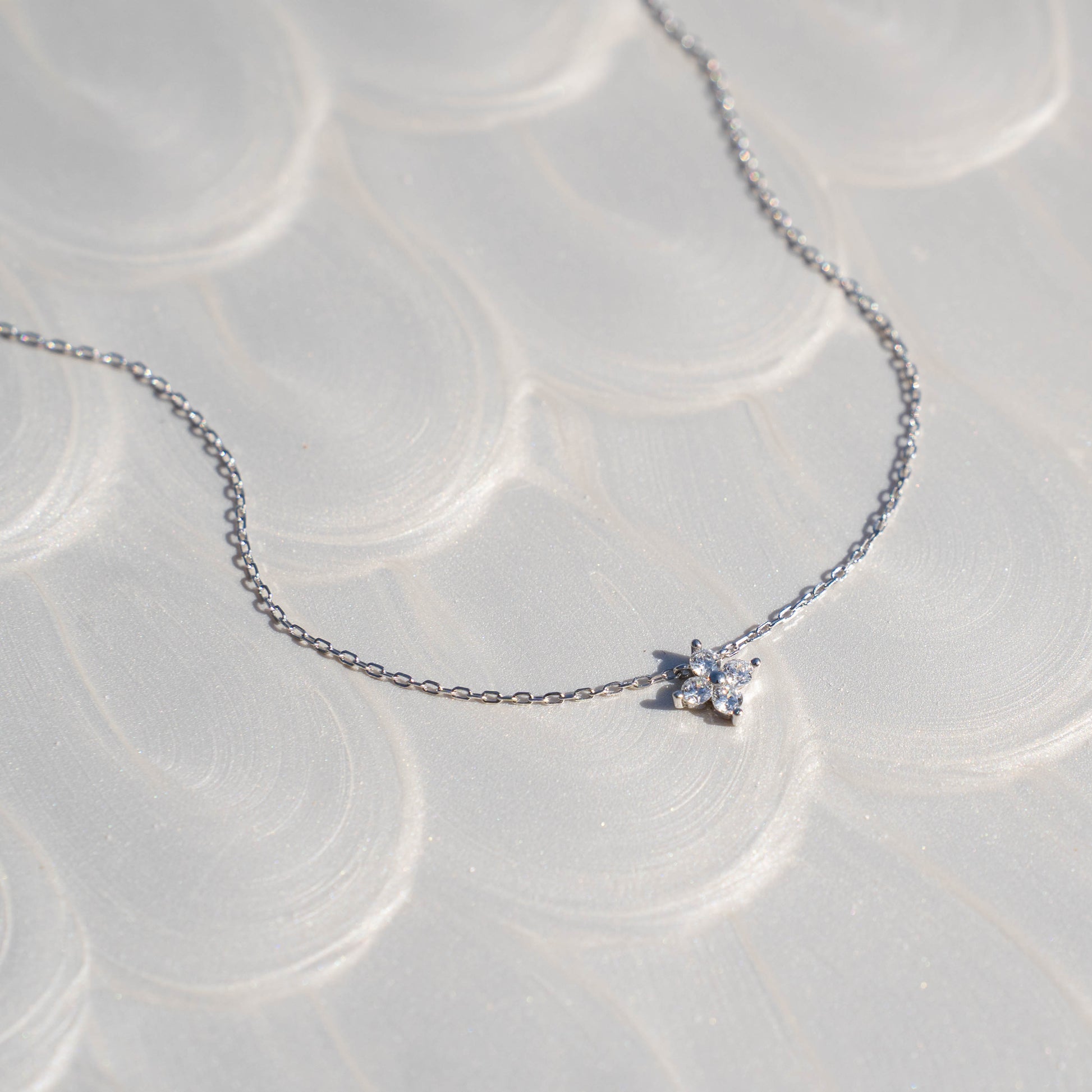 This necklace features four shimmering zirconia stones arranged in a delicate clover design — a quiet nod to balance, beauty, and a touch of luck. It’s designed to move effortlessly with you, reflecting sunlight like waves on the sea.